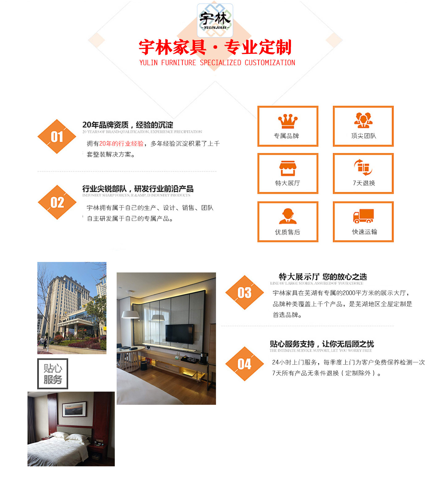 蕪湖宇林工貿有限公司創(chuàng)建于1996年,位于蕪湖高新技術開發(fā)區(qū)南區(qū),占地面積13000余平方米。是一個集研發(fā)、設計為一體的綜合性公司,公司主營整體家居定制、酒店家具定制、娛樂場所配套家具以及軟體系列,團隊,銳意革新、進去不息的理念,逐漸成為蕪湖家具行業(yè)的生產廠家,并在2006年注冊了“宇林”牌商標。宇林品牌家具依現(xiàn)代與古典相結合的多種實木家具、實木貼皮家具。家具做工精細,多用人工雕刻;其自然、典雅的風格在很大程度上引導著人...